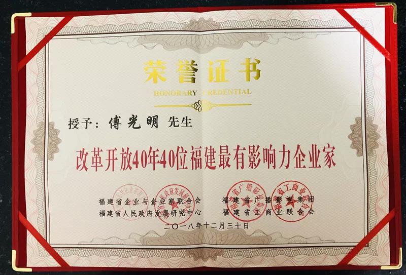 2018年12月30日,敢为天下先——改革开放40年福建经济荣耀盛典暨福建最有影响力企业家颁奖典礼在福建广电大剧院隆重召开。新葡的京集团3512vip创始人、福建新葡的京集团3512vip发展股份有限公司董事长傅光明先生荣获“改革开放40年40位福建最有影响力企业家”称号。值此辞旧迎新之际,与众多杰出企业家共同见证改革开放40年发展盛况。